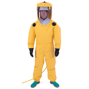 A reusable air-fed Type 2 ‘non-gas tight’ suit with integral cooling designed for use with breathable air supplied from an external positive pressure compressed air source.